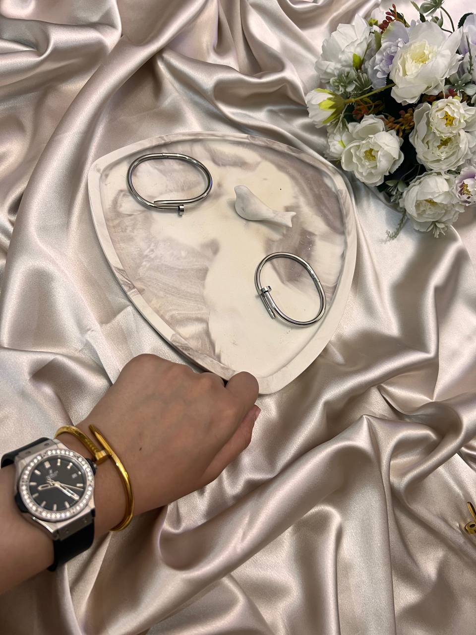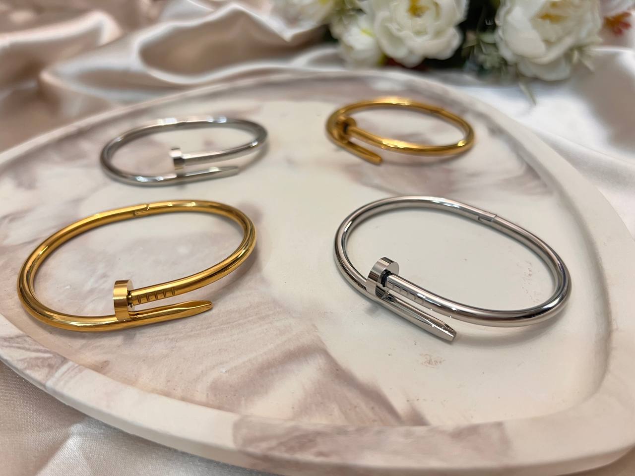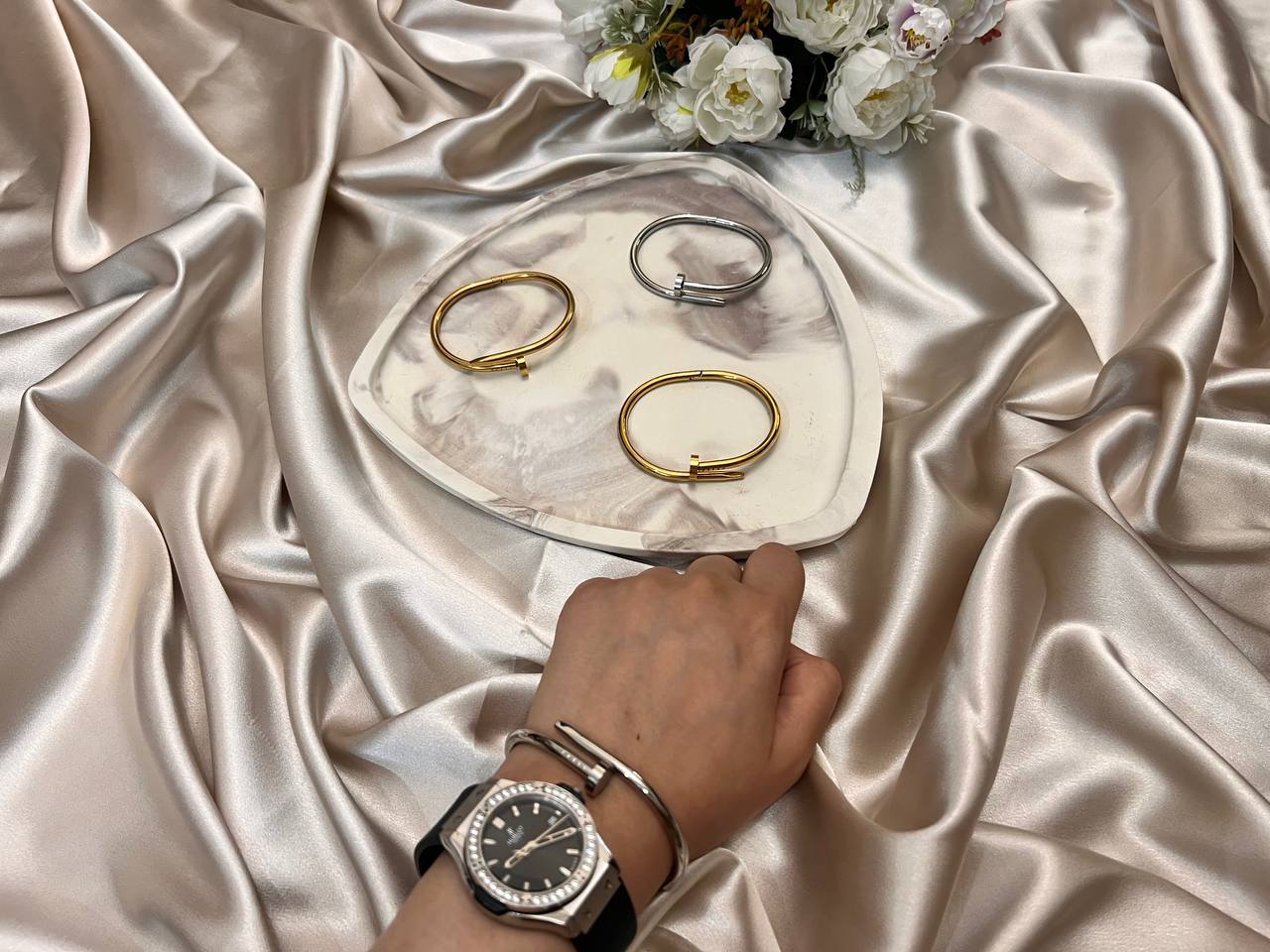 بنگل میخی کارتیر از استیل درجهیک ساخته شده و دارای رنگ ثابت و خاصیت ضدحساسیت است. این مدل بهخاطر طراحی نمادین و مدرنش، هم برای استفاده روزمره و هم برای مهمانی و مجالس انتخابی ایدهآل به شمار میآید. مقاومت بالا، درخشندگی ماندگار و قابلیت ست شدن با انواع زیورآلات از ویژگیهای محبوب این محصول است.